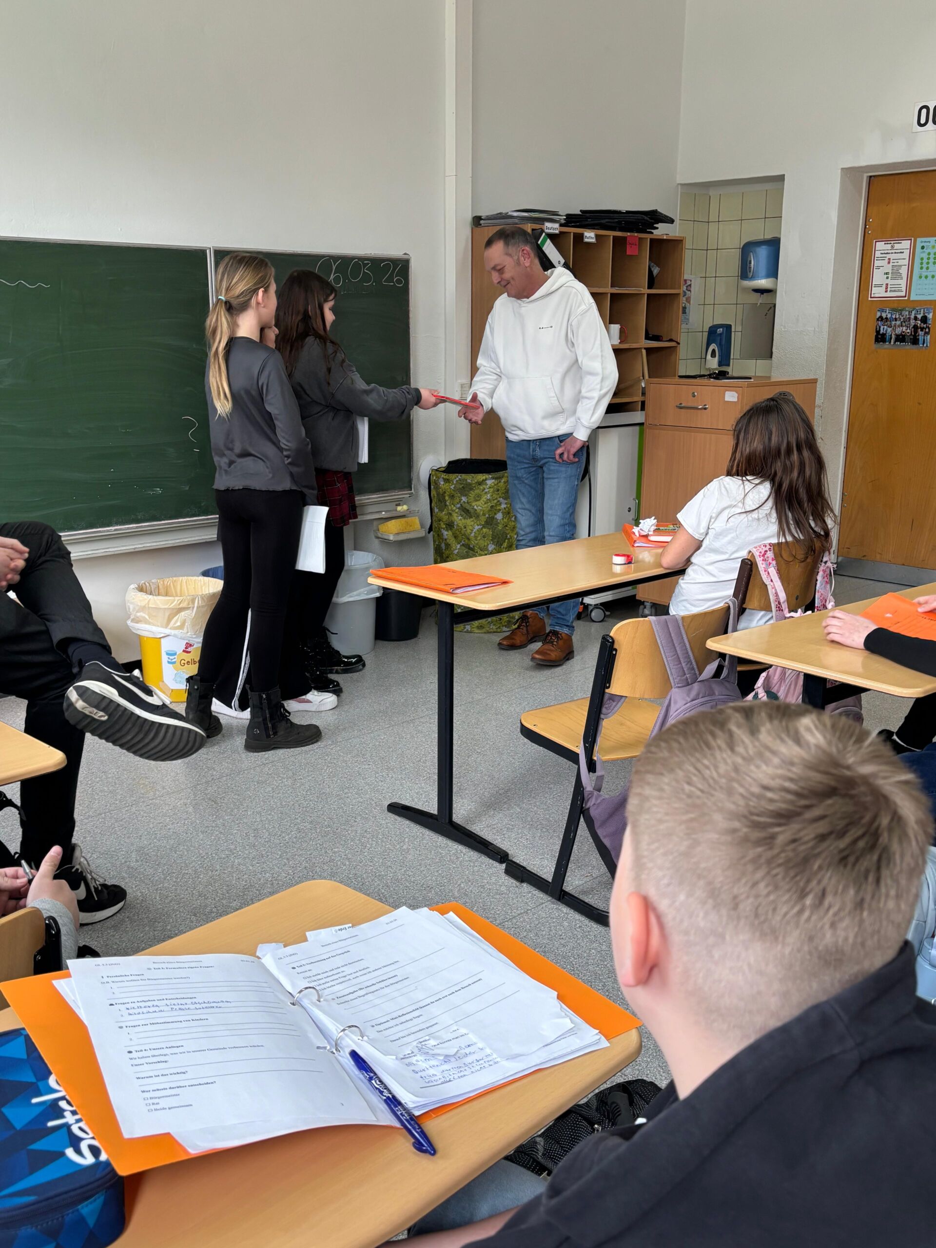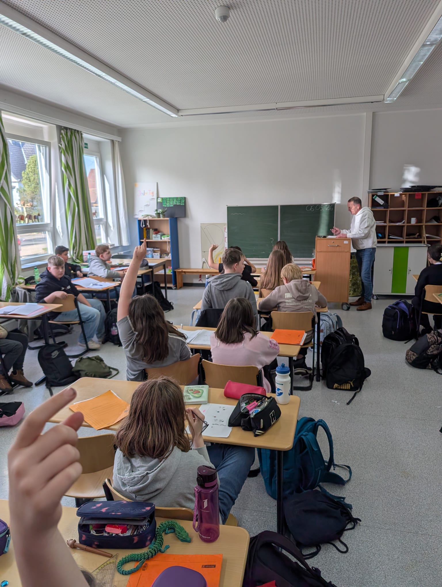 Am Freitag hat Christian Franke, Bürgermeister von Steinfurt, die Klasse 5.3 im Rahmen der Unterrichtsreihe „Mitbestimmung früher und heute“ besucht. Die Schüler*innen haben im GL-Unterricht Fragen zu seiner Arbeit vorbereitet und mit Herrn Franke ihre Wünsche, wie z.B. eine bessere Anbindung per Bus von Burgsteinfurt an unsere Schule, diskutiert. Am Ende haben drei Schüler*innen dem Bürgermeister stellvertretend für die Klasse gedankt und ihm ein kleines Geschenk überreicht. Vielen Dank an Herrn Franke, dass Sie sich die Zeit genommen haben!