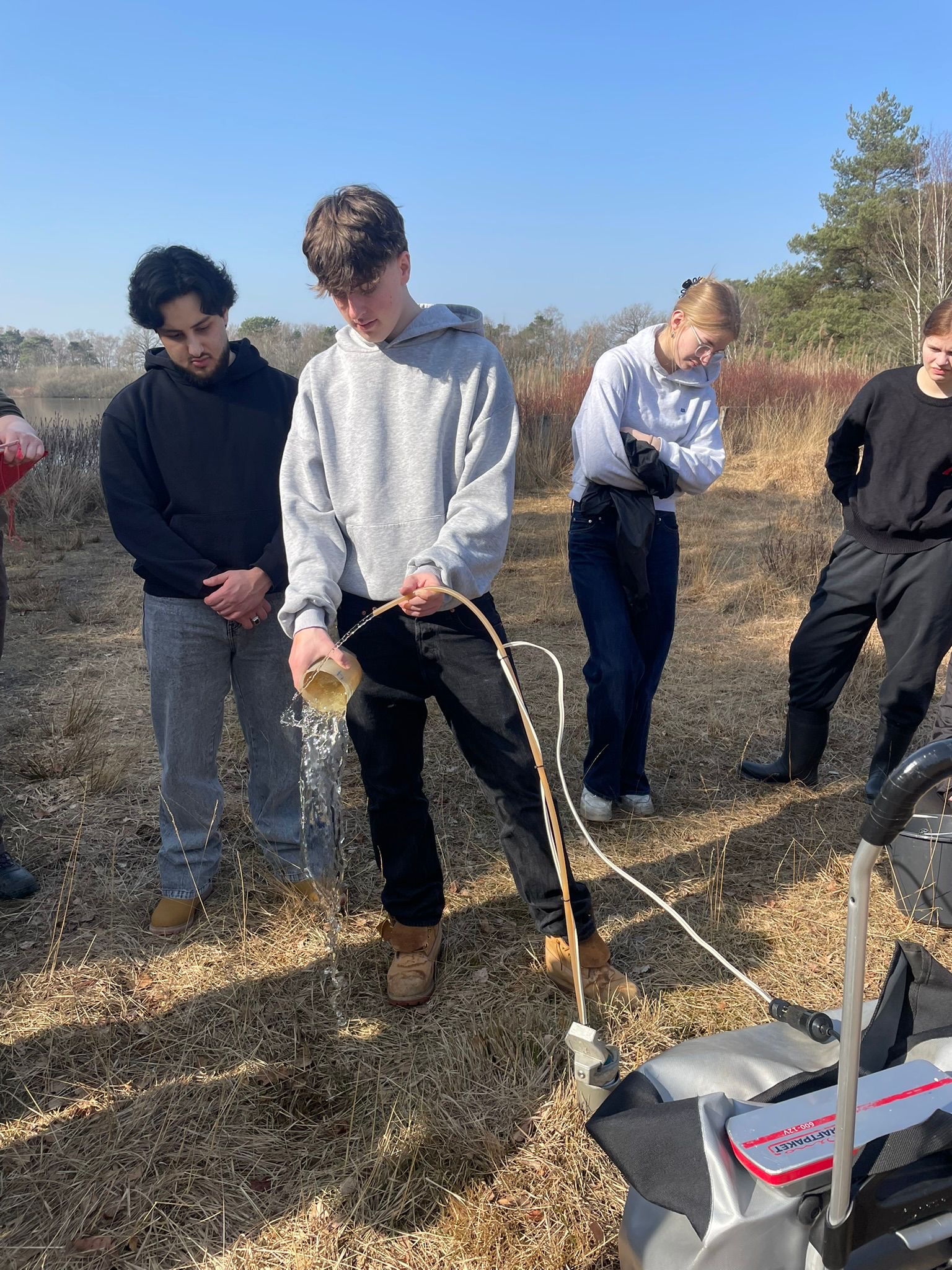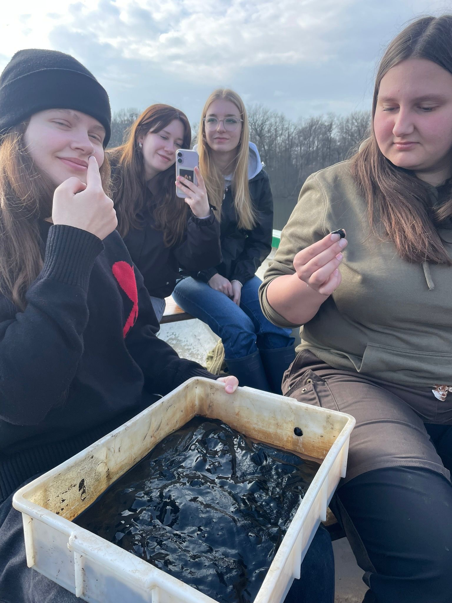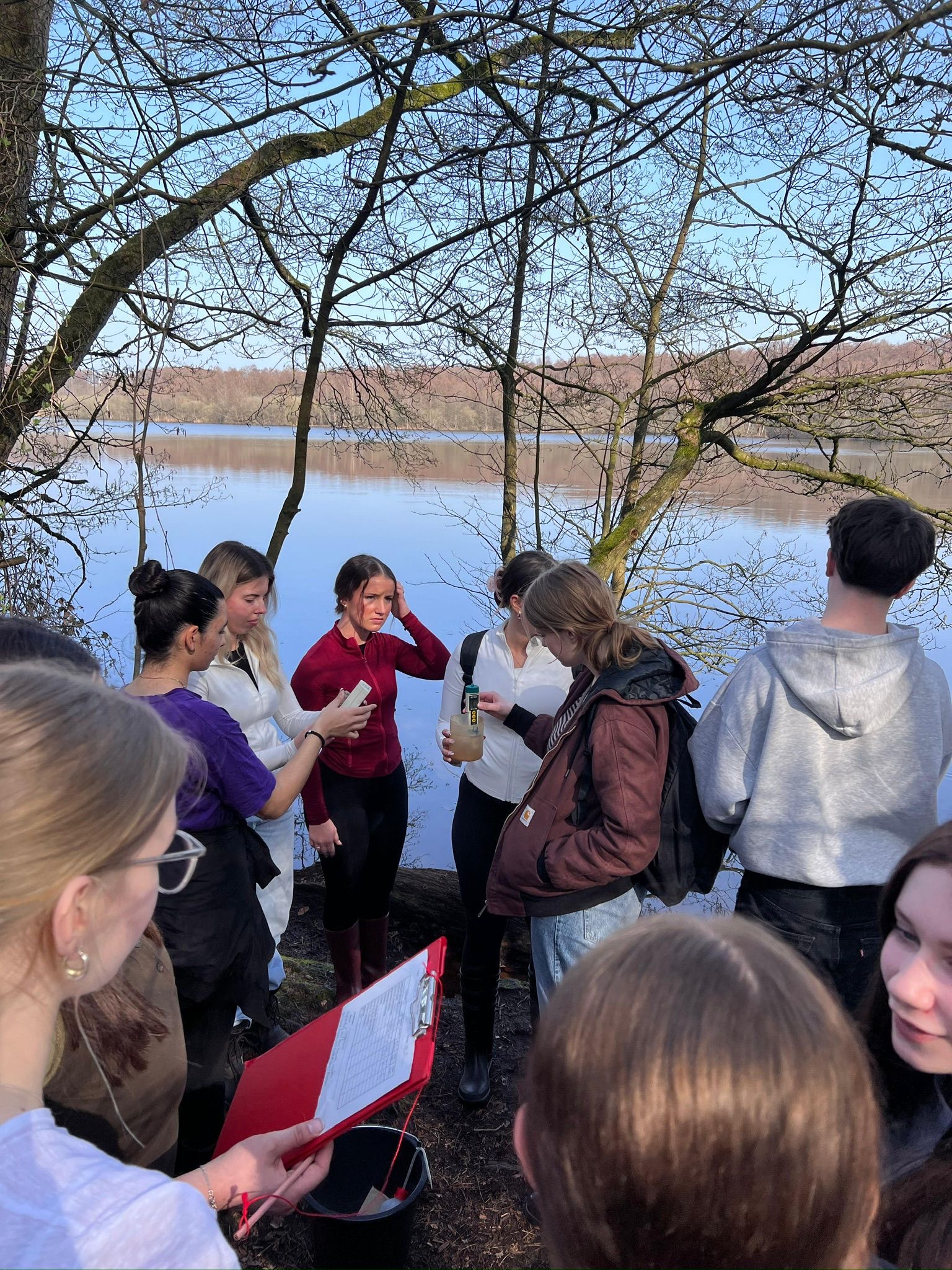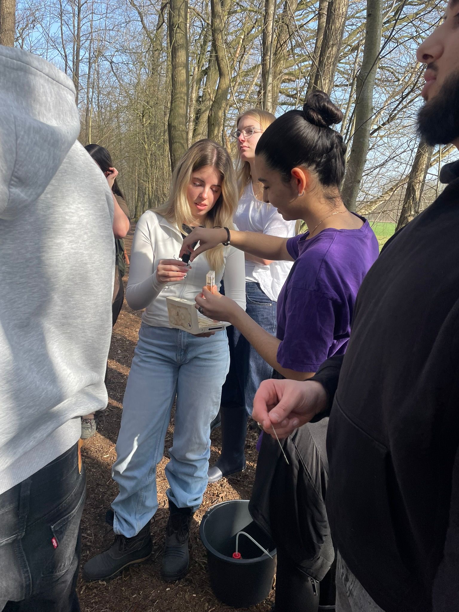 Am ersten Tag haben wir uns erstmal einen Überblick über das Gebiet verschafft und sind viel herumgelaufen. Dabei haben wir an verschiedenen Stellen Wasserproben genommen, aus den Seen und auch aus dem Grundwasser. Diese haben wir direkt untersucht, wir haben die Leitfähigkeit, den pH-Wert, die Temperatur den Nitratgehalt und den Ammoniumgehalt gemessen. Nebenbei haben wir auch viele Infos über das Gebiet bekommen und die Natur dort besser kennengelernt. Es war interessant zu sehen, wie unterschiedlich die Wasserwerte, je nach Ort, sein können. Am zweiten Tag wurde es dann noch spannender, wir sind mit Ruderbooten auf das große Heilige Meer gefahren. Dort haben wir Wasserproben aus verschiedenen Tiefen genommen, immer in Schritten von etwa einem Meter. Dabei konnten wir feststellen, dass sich die Bedingungen im See mit der Tiefe verändern, oben ist das Wasser meist wärmer und enthält mehr Sauerstoff, während es weiter unten kälter wird und teilweise weniger Sauerstoff vorhanden ist. Das ist typisch für viele Seen. Aus unseren Messungen haben wir ein sogenanntes Vertikalprofil erstellt, also eine Art Übersicht, wie sich die Werte im See von oben nach unten verändern. Außerdem haben wir Plankton gesammelt, das wir später noch genauer untersuchen wollten. Am letzten Tag haben wir uns das gesammelte Plankton unter dem Mikroskop angeschaut. Dabei konnten wir viele verschiedene kleine Organismen entdecken, zum Beispiel Nauplius-Larven und viele weitere Mikroorganismen.