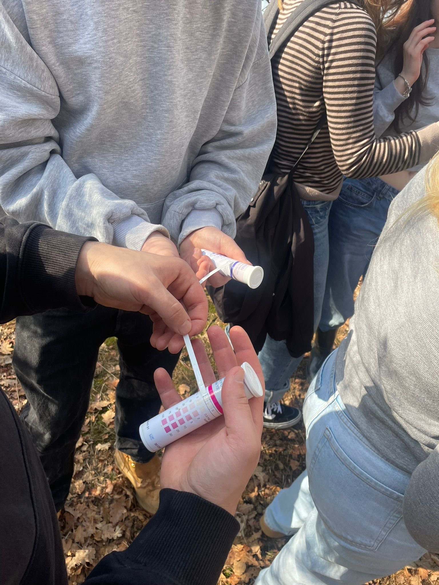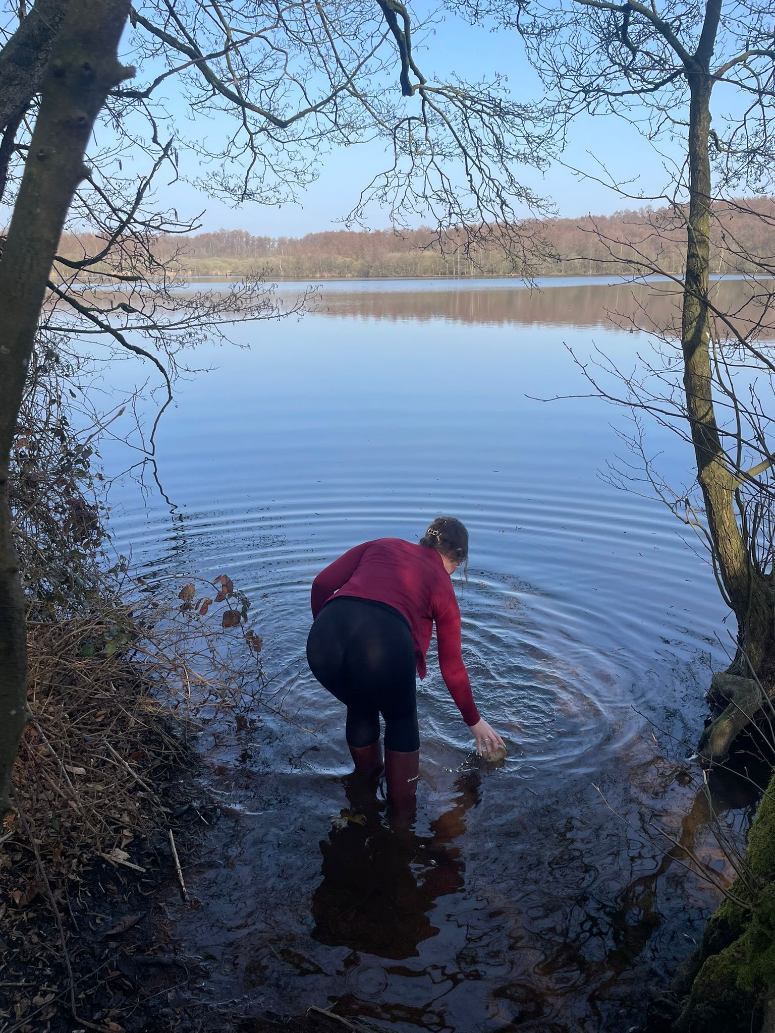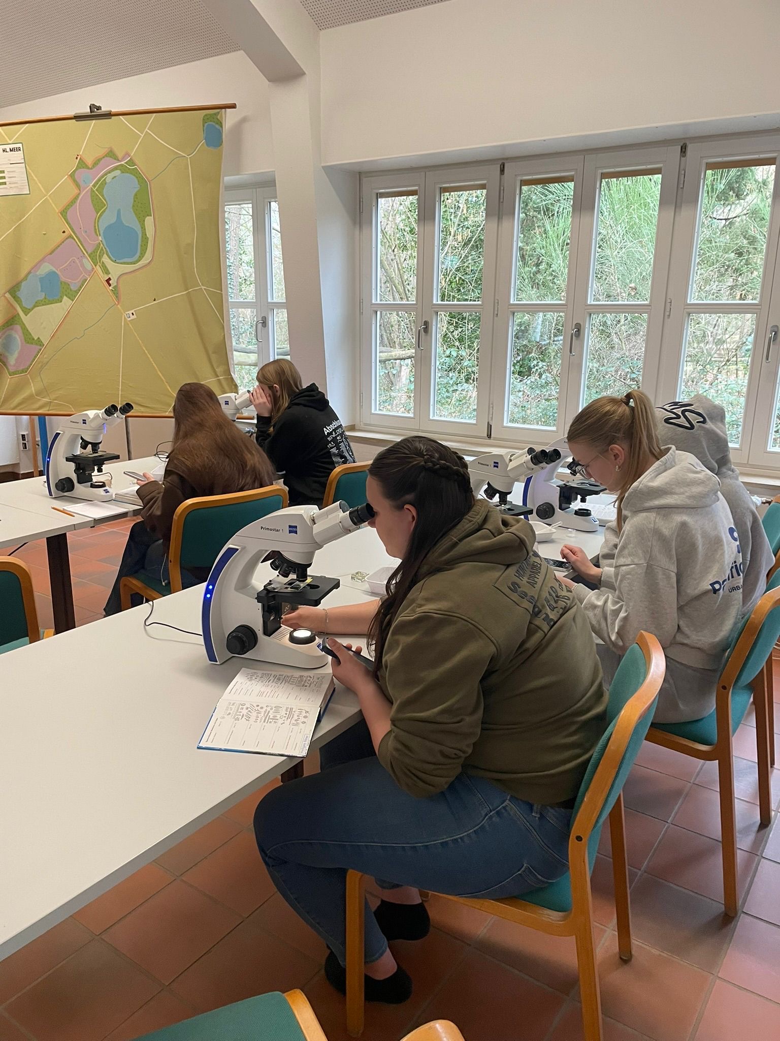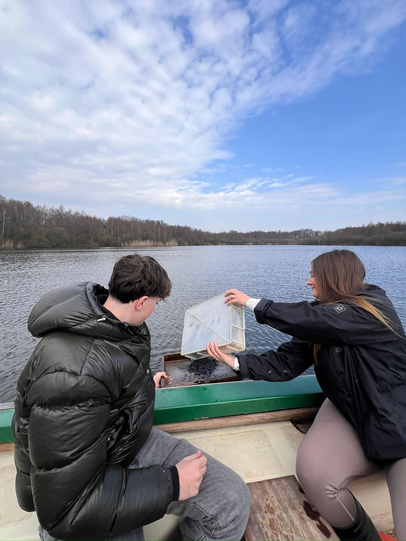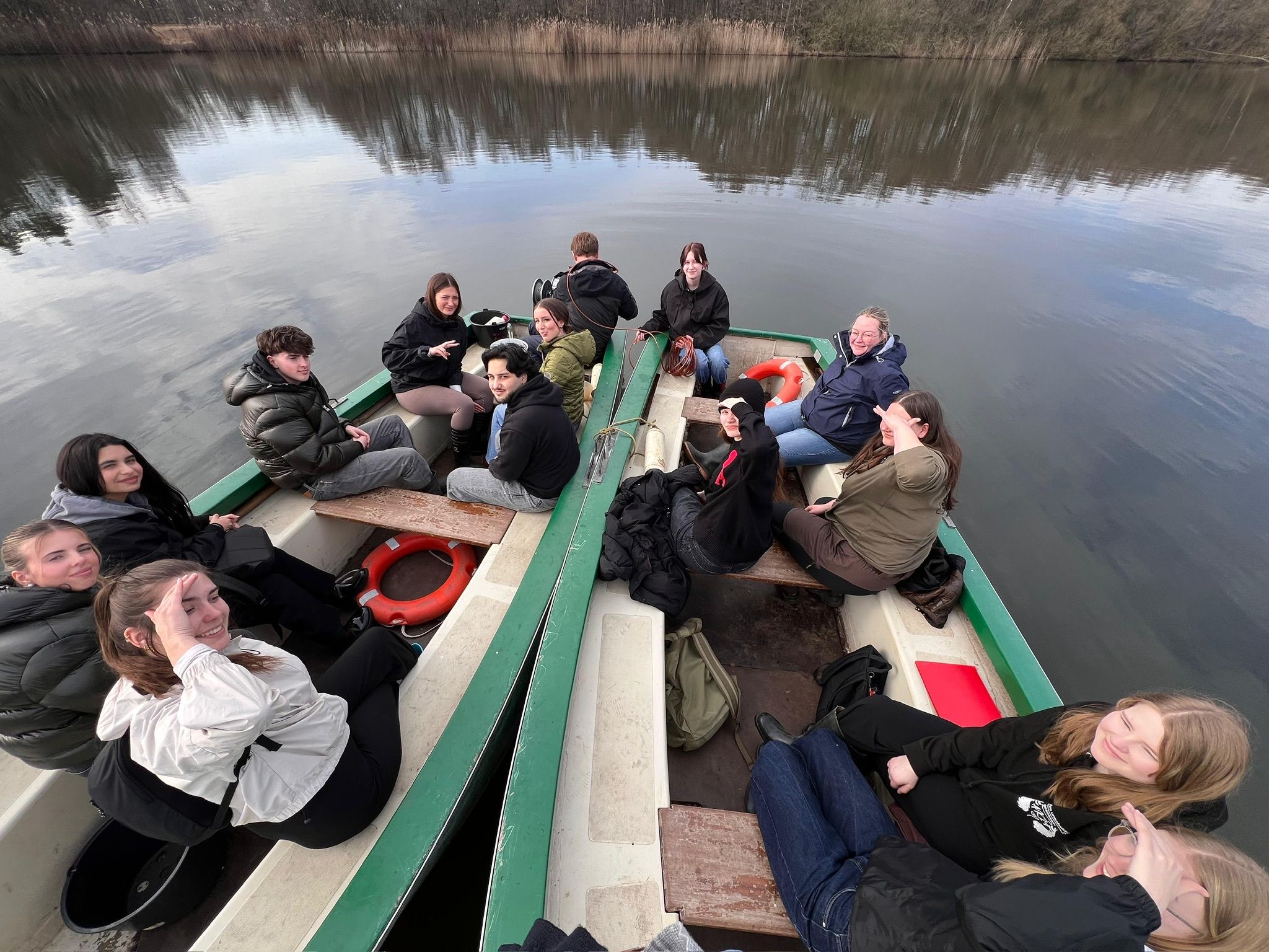 Am ersten Tag haben wir uns erstmal einen Überblick über das Gebiet verschafft und sind viel herumgelaufen. Dabei haben wir an verschiedenen Stellen Wasserproben genommen, aus den Seen und auch aus dem Grundwasser. Diese haben wir direkt untersucht, wir haben die Leitfähigkeit, den pH-Wert, die Temperatur den Nitratgehalt und den Ammoniumgehalt gemessen. Nebenbei haben wir auch viele Infos über das Gebiet bekommen und die Natur dort besser kennengelernt. Es war interessant zu sehen, wie unterschiedlich die Wasserwerte, je nach Ort, sein können. Am zweiten Tag wurde es dann noch spannender, wir sind mit Ruderbooten auf das große Heilige Meer gefahren. Dort haben wir Wasserproben aus verschiedenen Tiefen genommen, immer in Schritten von etwa einem Meter. Dabei konnten wir feststellen, dass sich die Bedingungen im See mit der Tiefe verändern, oben ist das Wasser meist wärmer und enthält mehr Sauerstoff, während es weiter unten kälter wird und teilweise weniger Sauerstoff vorhanden ist. Das ist typisch für viele Seen. Aus unseren Messungen haben wir ein sogenanntes Vertikalprofil erstellt, also eine Art Übersicht, wie sich die Werte im See von oben nach unten verändern. Außerdem haben wir Plankton gesammelt, das wir später noch genauer untersuchen wollten. Am letzten Tag haben wir uns das gesammelte Plankton unter dem Mikroskop angeschaut. Dabei konnten wir viele verschiedene kleine Organismen entdecken, zum Beispiel Nauplius-Larven und viele weitere Mikroorganismen.