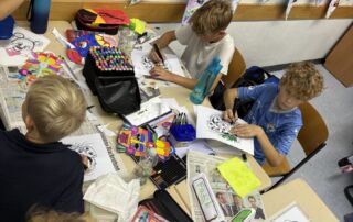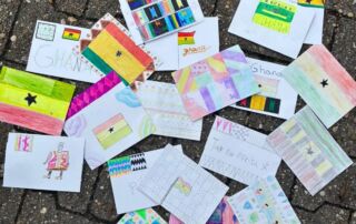 Die Klassen des siebten Jahrgangs arbeiteten kreativ zum Thema „Grenzenlos Ghana", indem sie ghanaische Stoffverarbeitung kennenlernten, eigene Postkarten herstellten und diese im Ort verteilten.